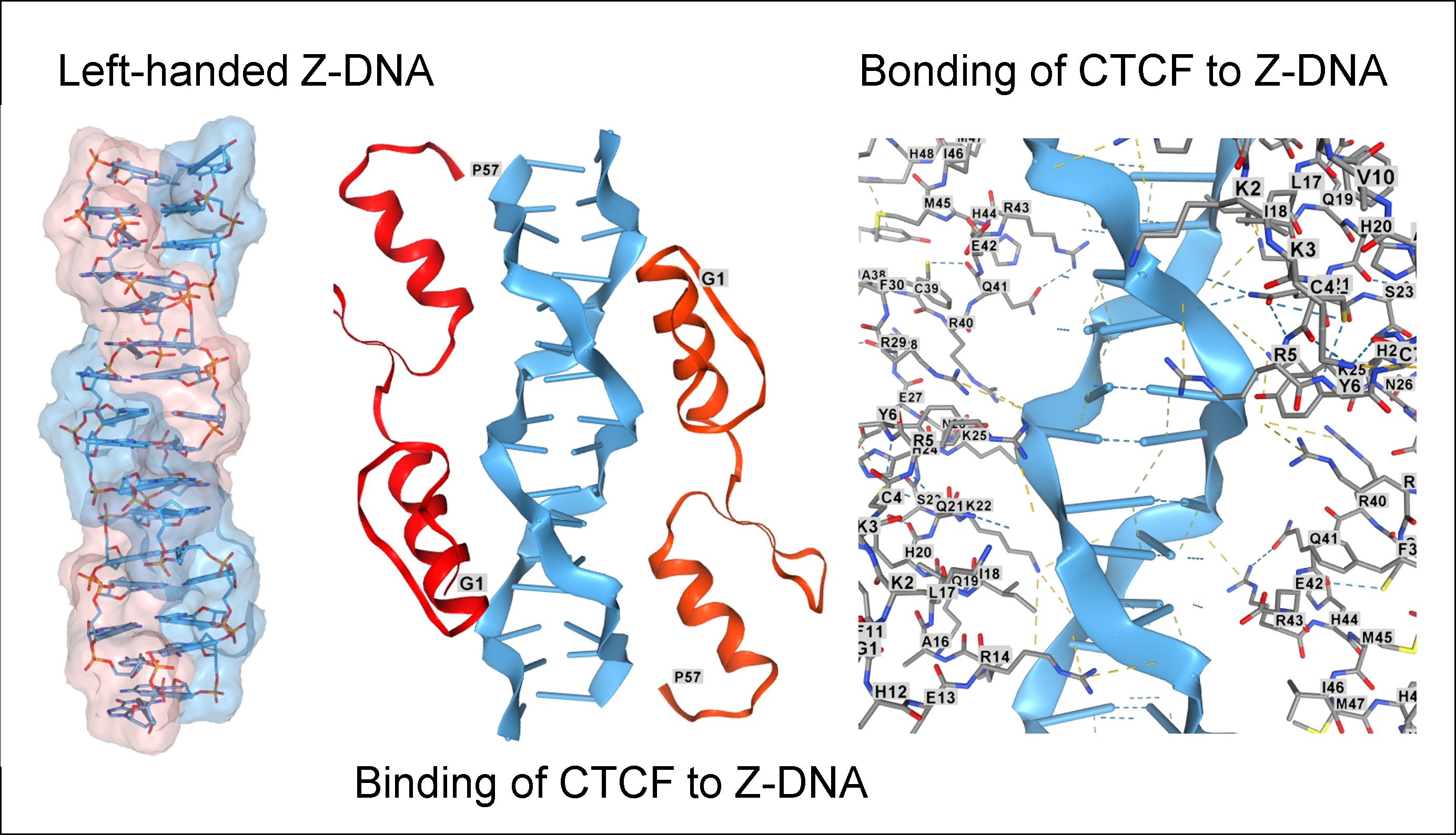 Previously, it was assumed that each zinc-finger domain only interacts with B-DNA. However, by use of computational modeling, Dr. Herbert revealed interaction modes with Z-DNA in which the domain binds to the Z-DNA structure rather than through recognition of each base. These findings show that the zinc fingers bind to both B-DNA and Z-DNA through the same domain. The nature of the interaction differs. The binding to Z-DNA is structure-specific rather than sequence-specific. The sequences that form Z-DNA inside cells are called flipons. They can transition between B-DNA and Z-DNA without a change in sequence or a scission of the DNA backbone.